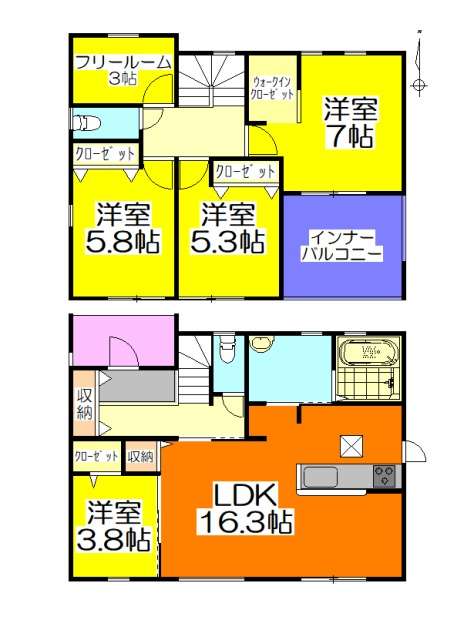間取りは使い勝手の良い4LDKに加えて、ウォークインクローゼットを備えた収納力抜群の設計。人気の対面式キッチンやリビング階段を採用し、家族とのつながりを感じながら生活できる間取りとなっています。